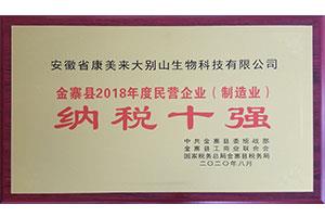 榮獲:金寨縣2018年度民營企業(yè)(制造業(yè))“納稅十強(qiáng)”稱號