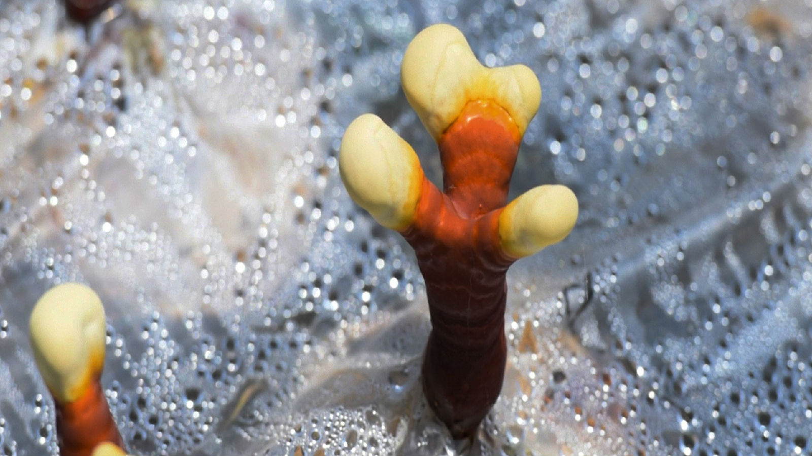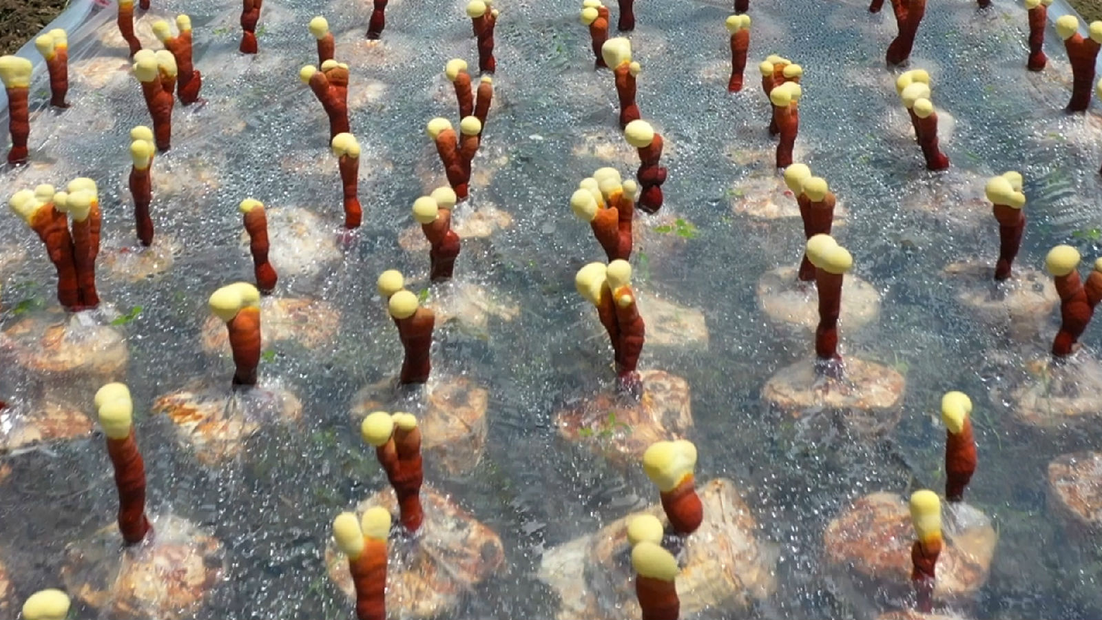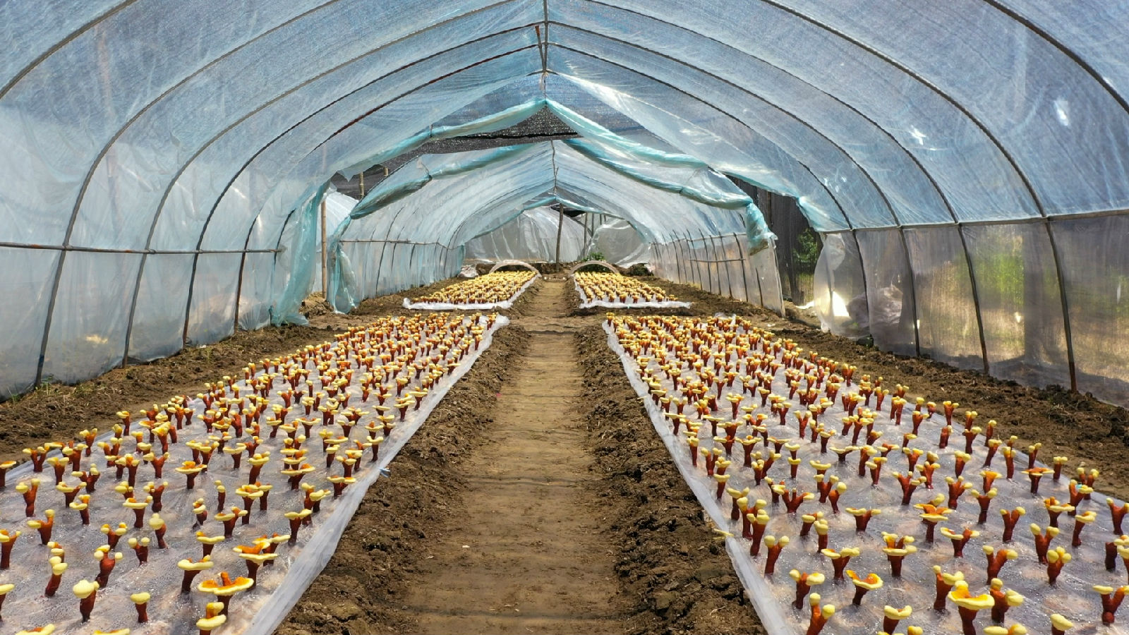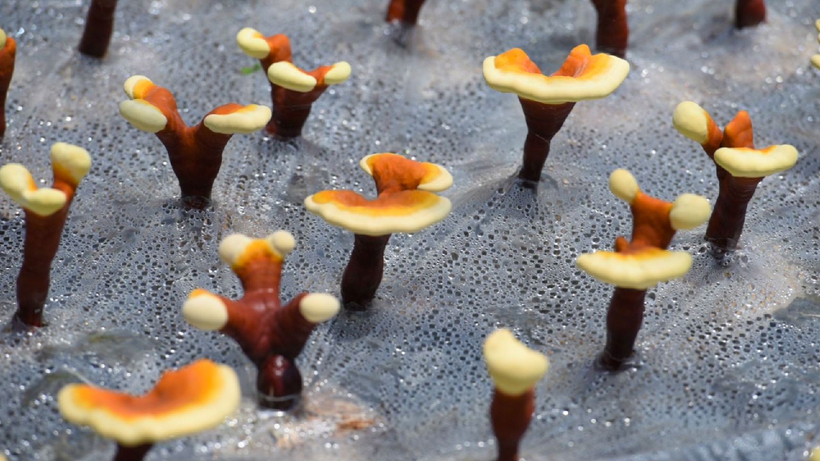 走進(jìn)靈芝基地,一排排整齊的大棚嚴(yán)整壯闊,與四周連綿的青山相映成趣,棚內(nèi)一棵棵靈芝整齊排列,朵朵嫩蕾色彩嬌艷,構(gòu)成了一幅美麗的夏日畫卷。黃總介紹:這塊基地面積20畝,菌棒已開始發(fā)芽,正處于菌桿生長(zhǎng)階段。沈業(yè)壽教授考察后指出:現(xiàn)蕾階段的靈芝需要精心觀察護(hù)理,防止雜菌感染。