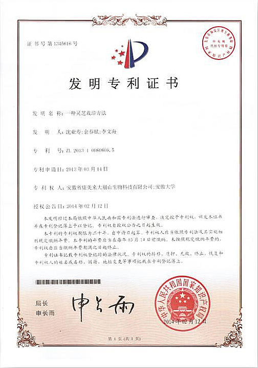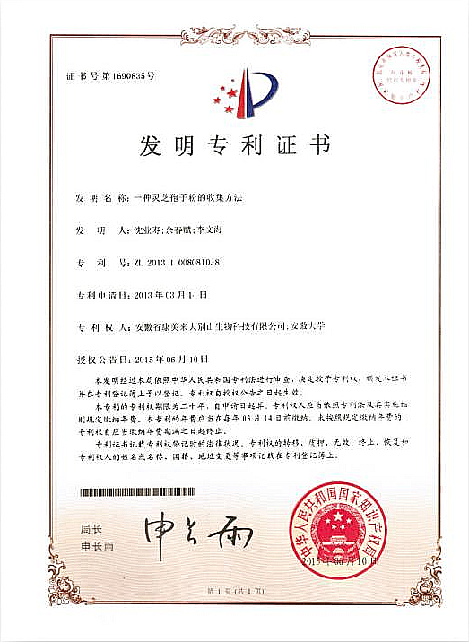 六、應(yīng)用國(guó)家發(fā)明專利技術(shù)。我公司通過自主科技創(chuàng)新,擁有兩項(xiàng)國(guó)家發(fā)明專利技術(shù):“一種靈芝栽培方法”,專利號(hào):ZL201310080809.5 ;“一種靈芝孢子粉的收集方法”,專利號(hào):ZL201310080810.8。