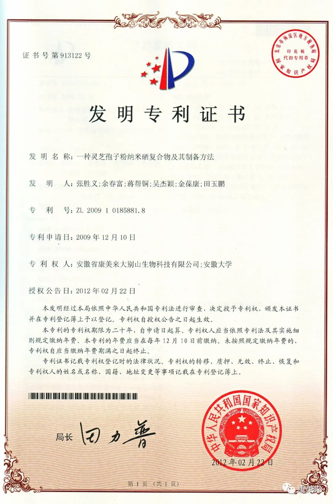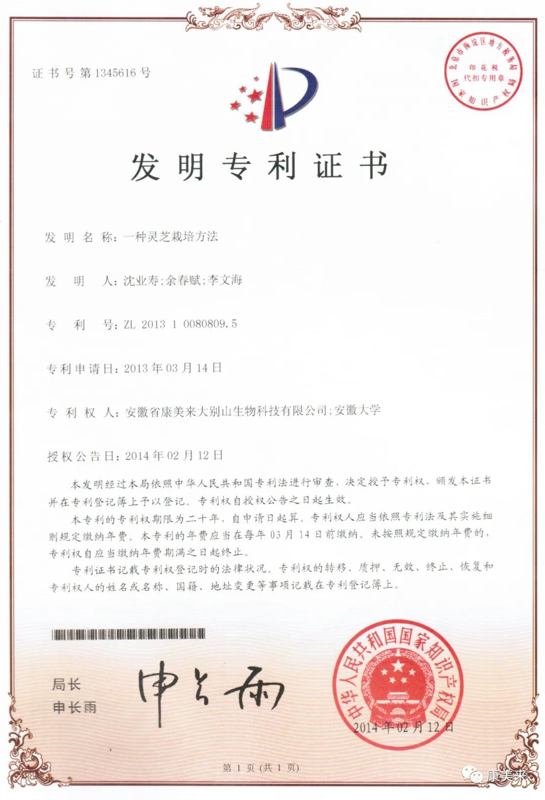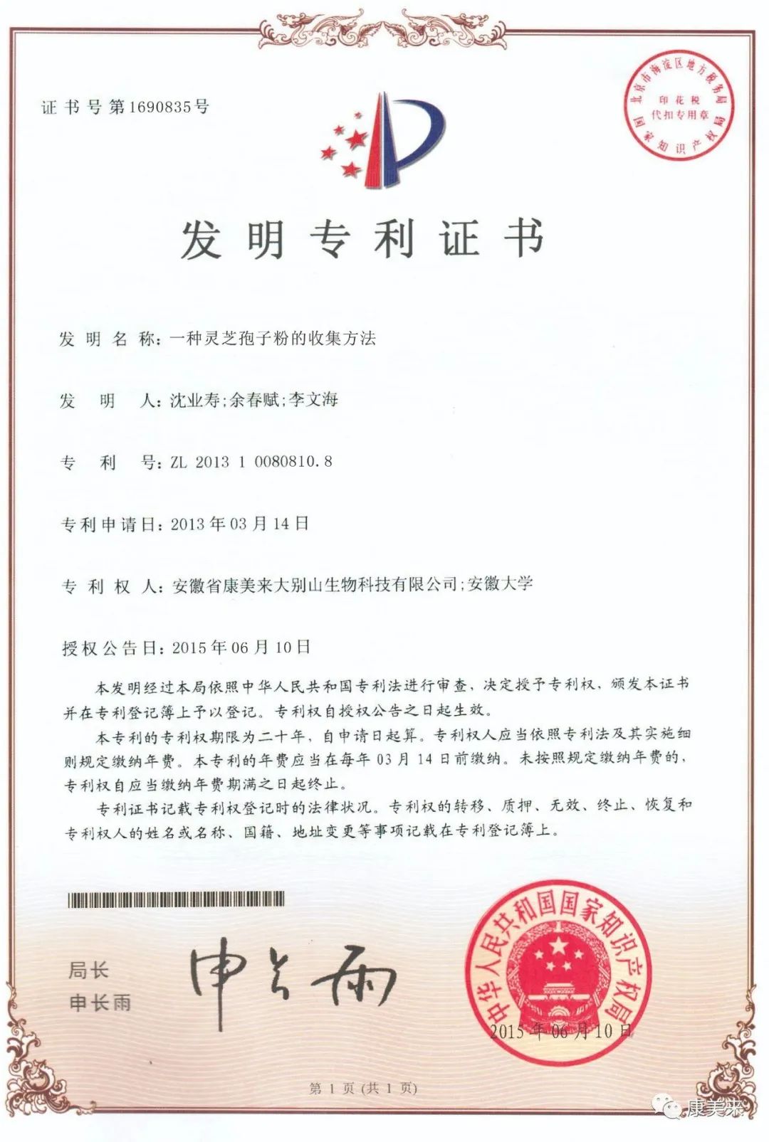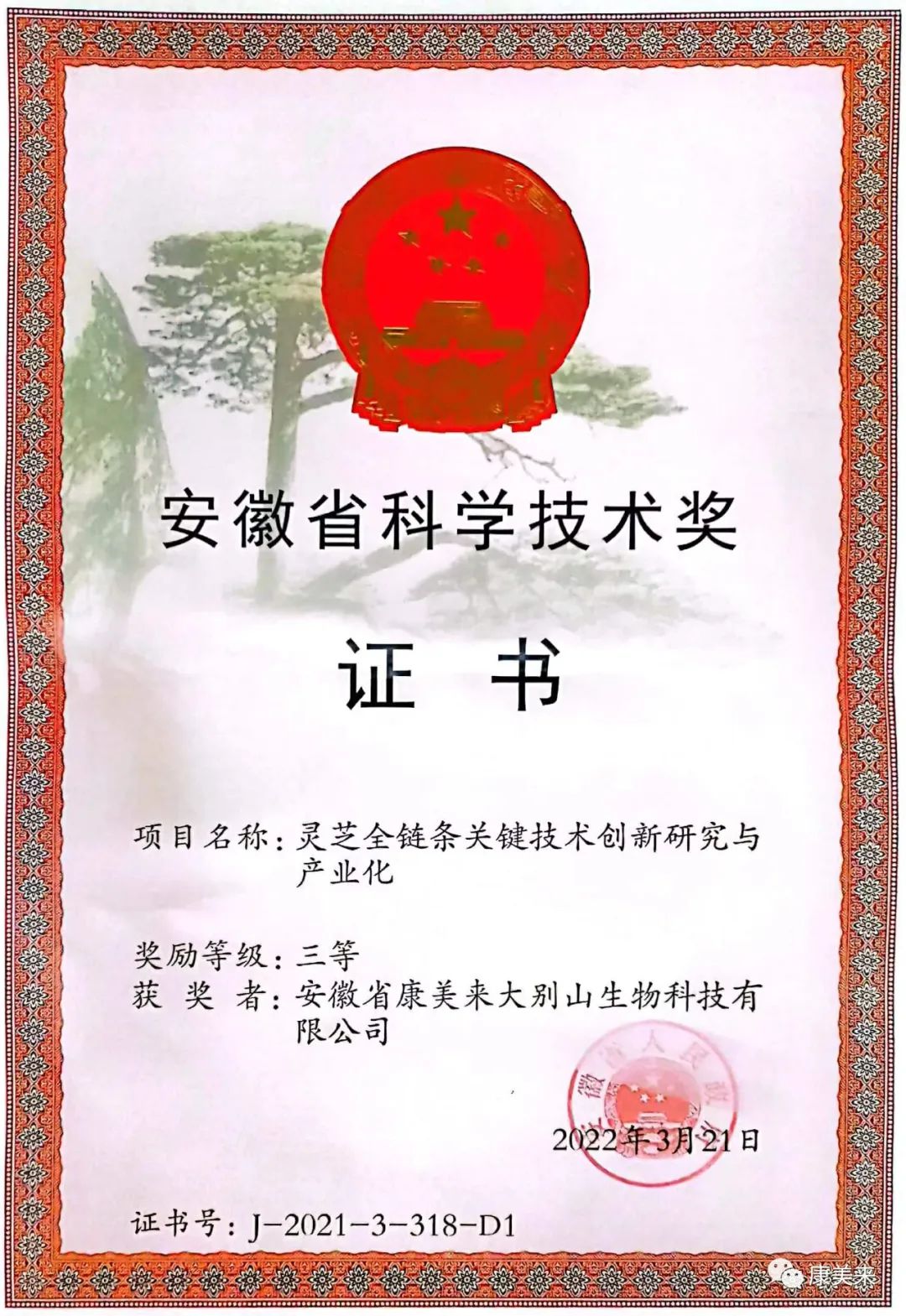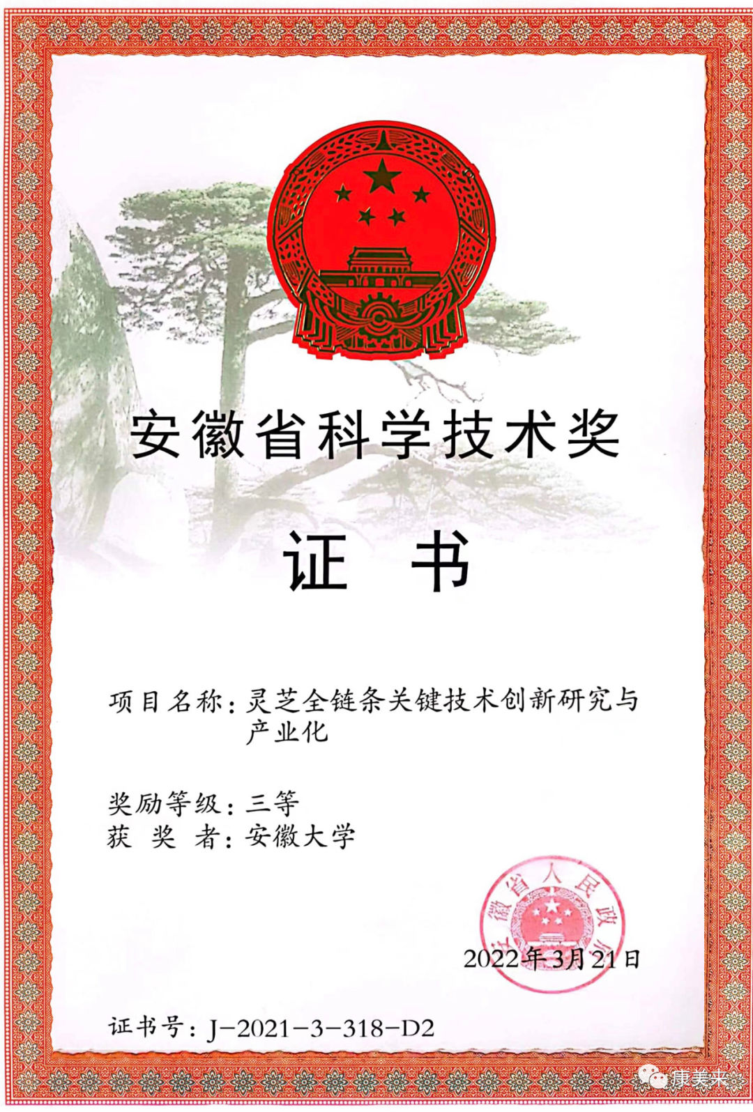 安徽省人民政府向安徽省康美來大別山生物科技有限公司、安徽大學(xué)沈業(yè)壽教授等單位和個(gè)人頒發(fā)“安徽省科技技術(shù)獎(jiǎng)”證書,這是康美來公司與安徽大學(xué)開展產(chǎn)學(xué)研合作十五年在大別山靈芝研究領(lǐng)域取得的重大成就,得到省、市、縣政府的高度肯定。