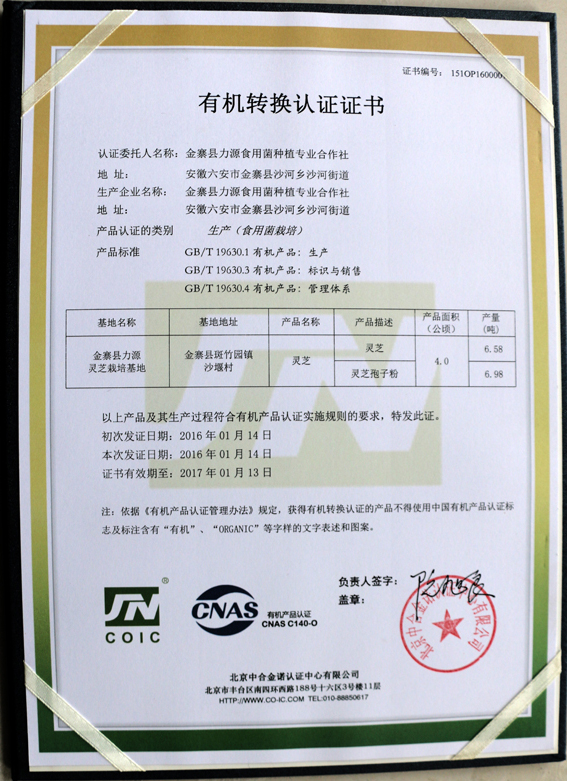 康美來公司高度重視產(chǎn)品源頭藥材基地建設(shè),要求旗下合作社不打農(nóng)藥不施化肥,有機(jī)種植。2016年,康美來旗下合作社——金寨縣力源食用菌種植專業(yè)合作社種植的靈芝及靈芝孢子粉通過了有機(jī)轉(zhuǎn)換認(rèn)證(證書編號(hào):151OP1600007)。