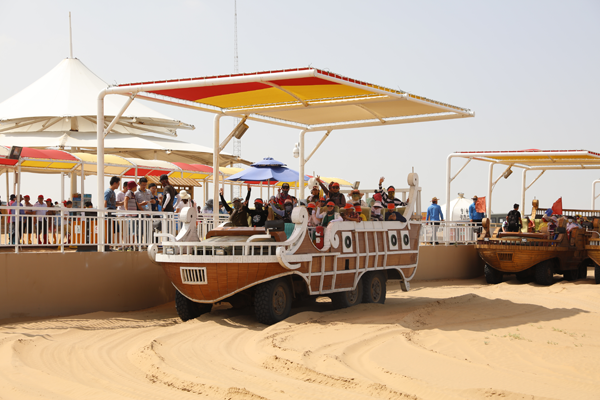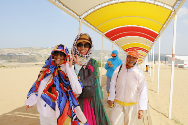 2日上午,大家一同抵達了“世界罕見,中國之最”的銀肯響沙灣,它就像一根掛在黃河上的弦,金黃色的沙坡浩瀚無際,在藍天白云下又好似一條金黃色的臥龍,風(fēng)一吹,沙子如水流動,沙沙作響,像一曲激昂澎湃的交響樂。索道、穿沙襪、沙漠沖浪車、滑沙、騎駱駝、高空滑索......妙趣橫生,大家玩得流連忘返!