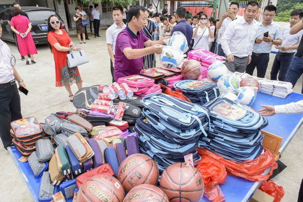 上午10時許,當(dāng)滿載書包文具和體育用品的汽車開進(jìn)校園時,立即受到等候多時的孩子們的熱烈歡迎。