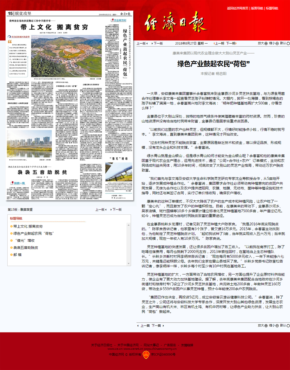 《經(jīng)濟(jì)日?qǐng)?bào)》今日刊發(fā)康美來(lái)集團(tuán)精準(zhǔn)扶貧采訪文章:“康美來(lái)集團(tuán)以現(xiàn)代農(nóng)業(yè)理念做大大別山靈芝產(chǎn)業(yè)——綠色產(chǎn)業(yè)鼓起農(nóng)民‘荷包’”