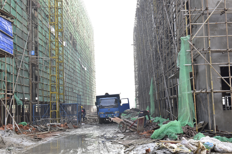 6層高的高檔公寓樓已經(jīng)完成封頂,腳手架林立,預(yù)計(jì)2019年3月前完成墻面工程。