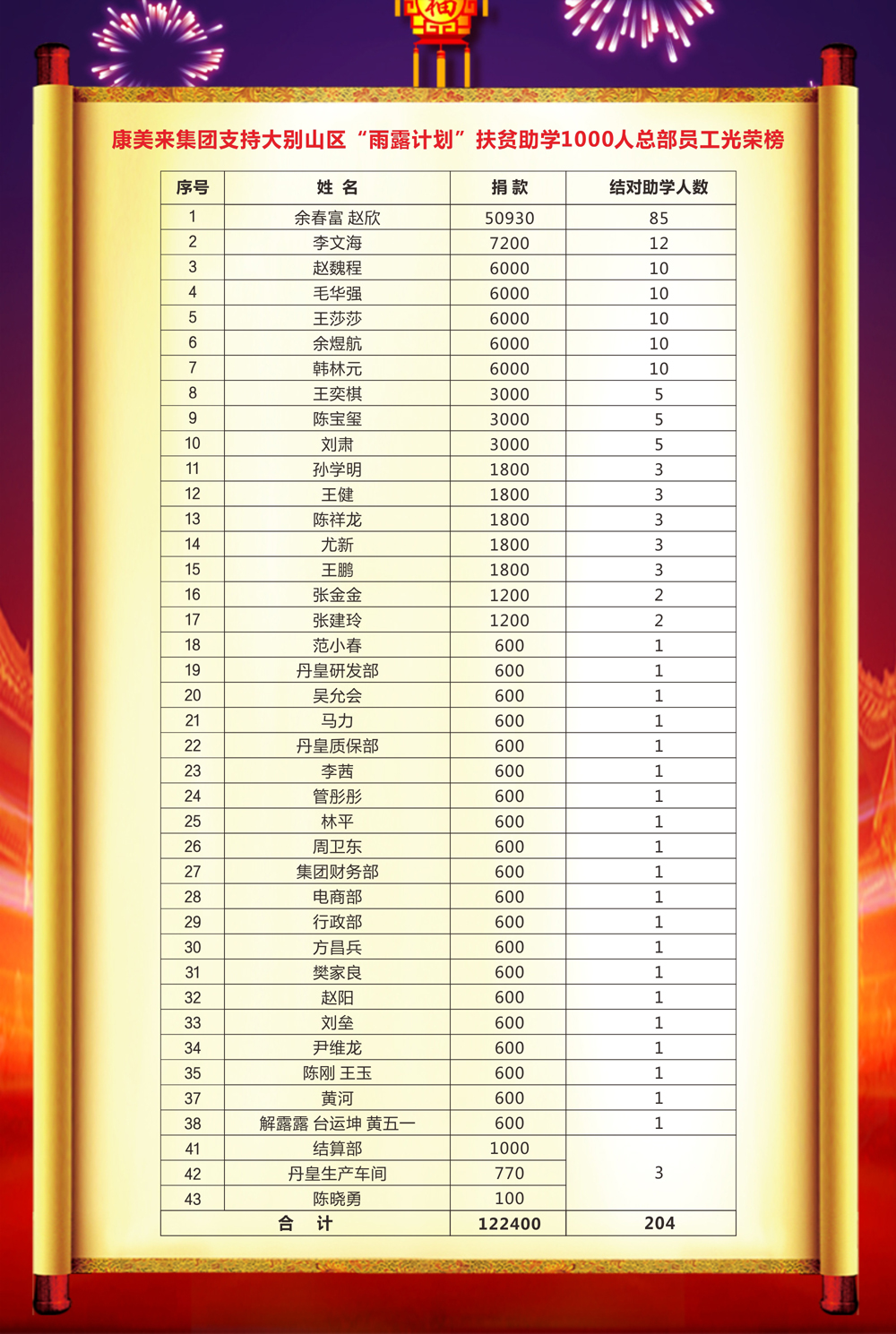 康美來(lái)集團(tuán)廣大經(jīng)銷商和干部職工支持金寨縣政府“雨露計(jì)劃”2019年度實(shí)施扶貧助學(xué)結(jié)對(duì)大別山區(qū)貧困學(xué)生1000人行動(dòng),實(shí)際達(dá)成結(jié)對(duì)1112人,總捐款667200元。現(xiàn)發(fā)布光榮榜,予以表?yè)P(yáng)。