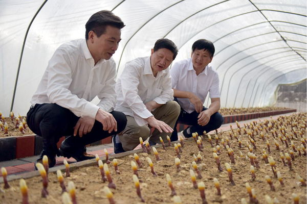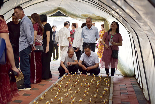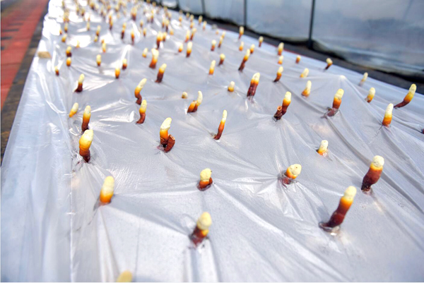 早期栽培的靈芝已長(zhǎng)出嫩芽,色澤鮮艷,整齊排列,迎接遠(yuǎn)方的客人。