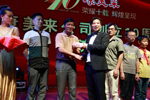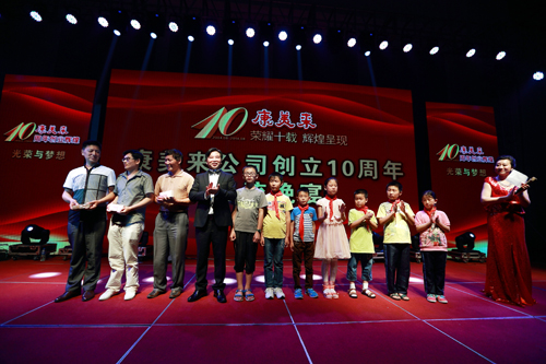 在康美來公司10周年創(chuàng)業(yè)輝煌晚會上,余春賦董事長把110400元現(xiàn)金現(xiàn)場捐助給金寨縣沙河鄉(xiāng)中心小學、燕子河鎮(zhèn)樹林小學、青山鎮(zhèn)姜河中心小學184名貧困學生,支持政府雨露計劃。公司自2014年起,發(fā)動公司干部和伙伴開展結(jié)對扶貧助學,奉獻愛心,回饋社會。2014年由過去的117名,增加到184名學生,由2所小學增加到3所小學。扶貧辦主任劉澤祥參加捐助活動并講話。