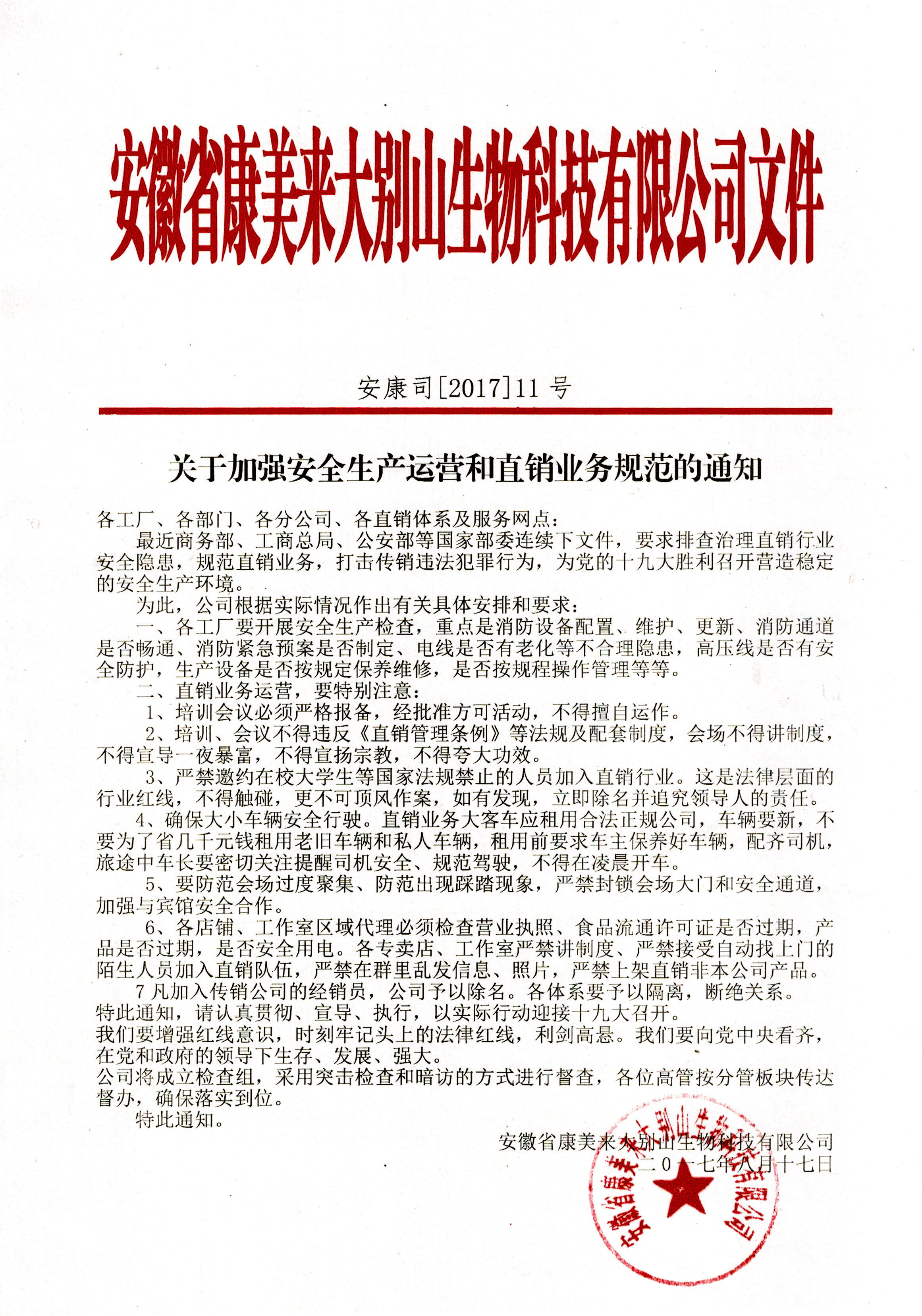 關于加強安全生產(chǎn)運營和直銷業(yè)務規(guī)范的通知